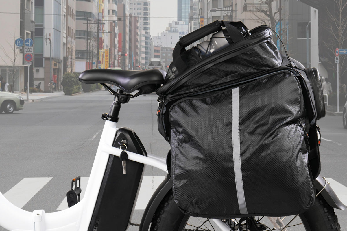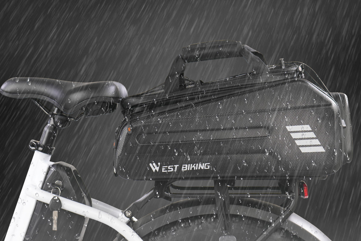 10-20L Expandable Capacity: With a foldable/expandable design that allows for flexible capacity changes, this bike trunk bag has a maximum capacity of 20L. The Bike Rear Pannier Bag can be used to carry an ebike battery, clothes, pumps, flashlights, etc. This storage bag includes 2 side compartment pockets, enough to carry on essentials for a long time biking, and help to get your essentials well organized.