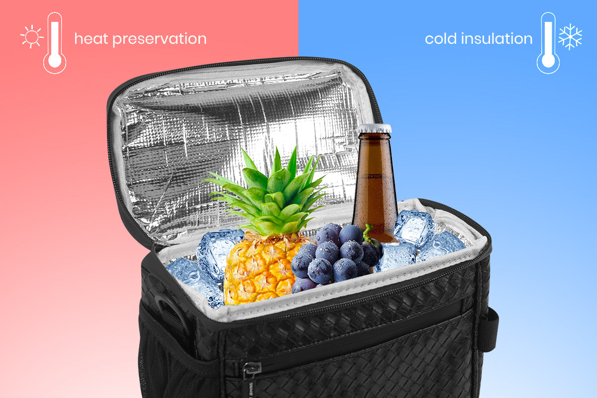 Durable Material: The exterior is made of woven leather material, which is more durable and scratch-resistant. With good waterproof performance, it can protect your valuables from water and dust. It comes with a layer of aluminum film interior, which can achieve the effect of heat preservation and ice preservation, and keep the food or beverage you bring fresh.