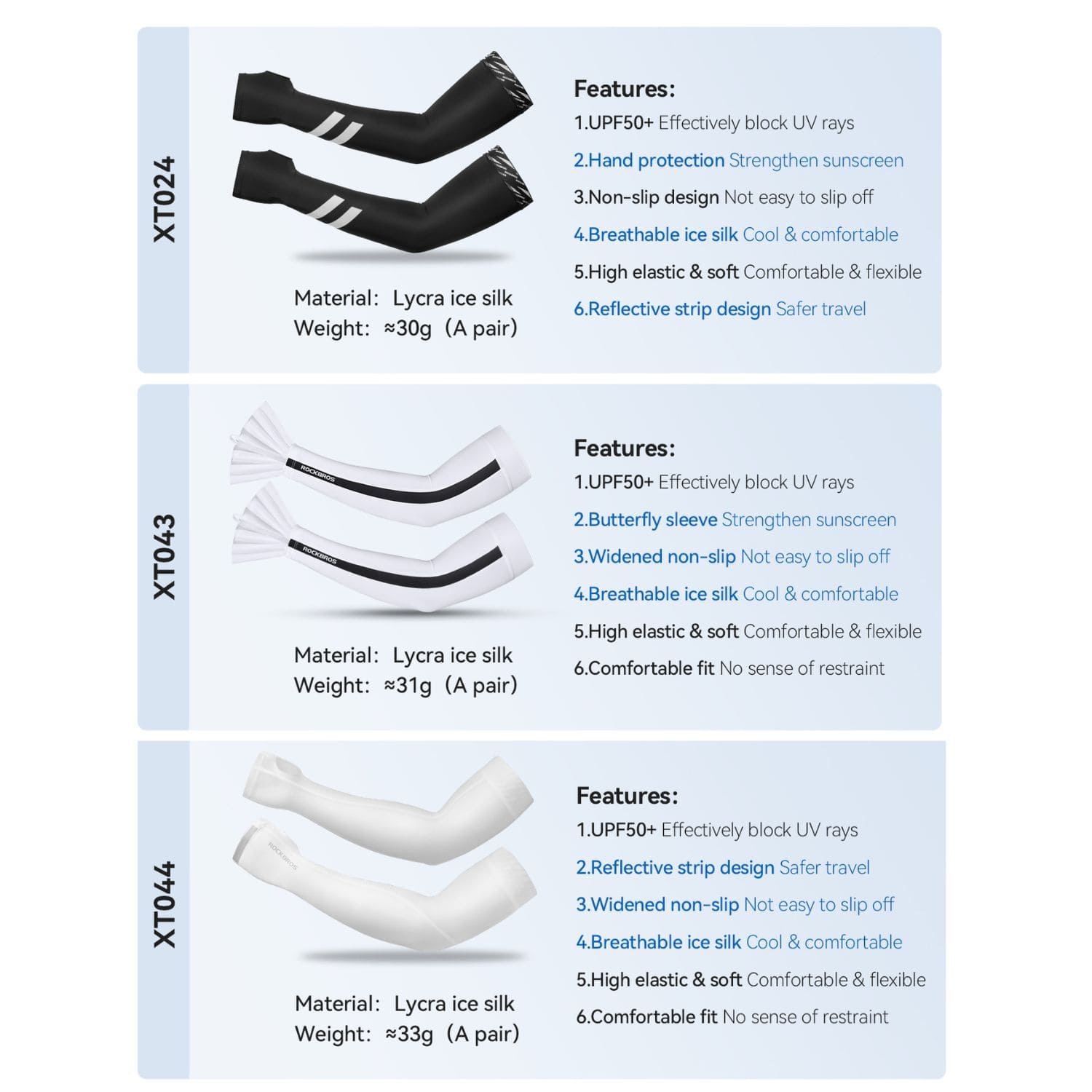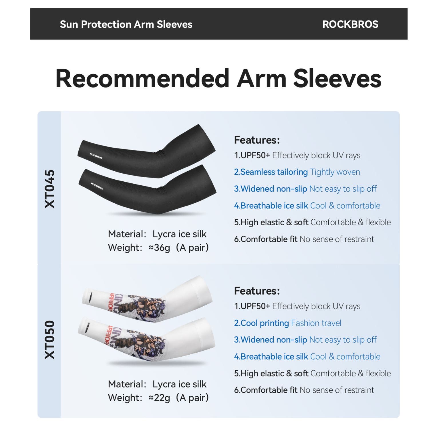 • Cooling Ice Silk Fabric:Breathable ice silk material feels cool to the touch, helping reduce heat buildup and keeping your arms comfortable in hot weather.