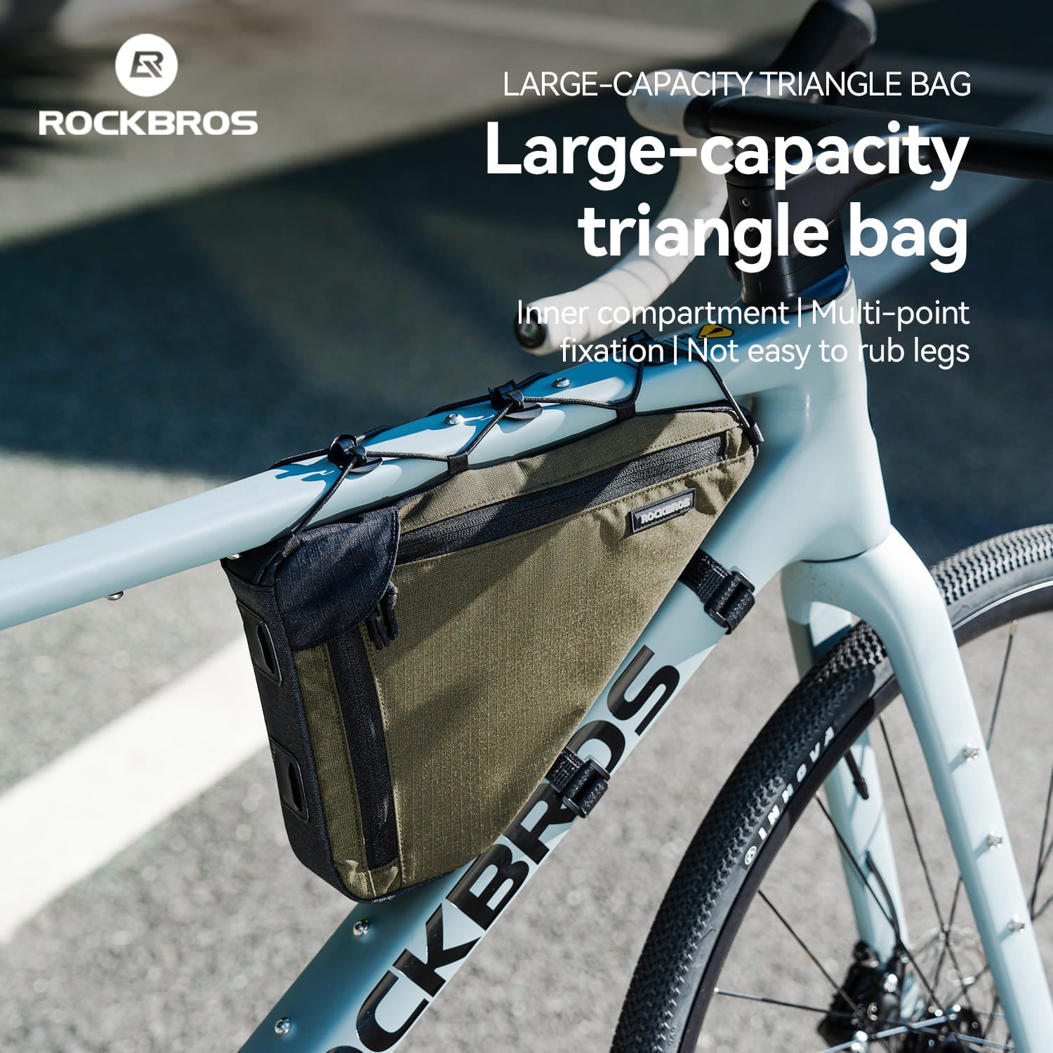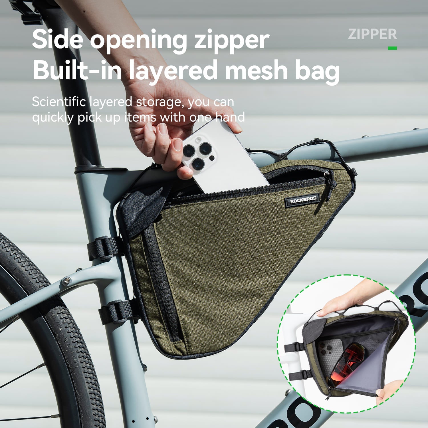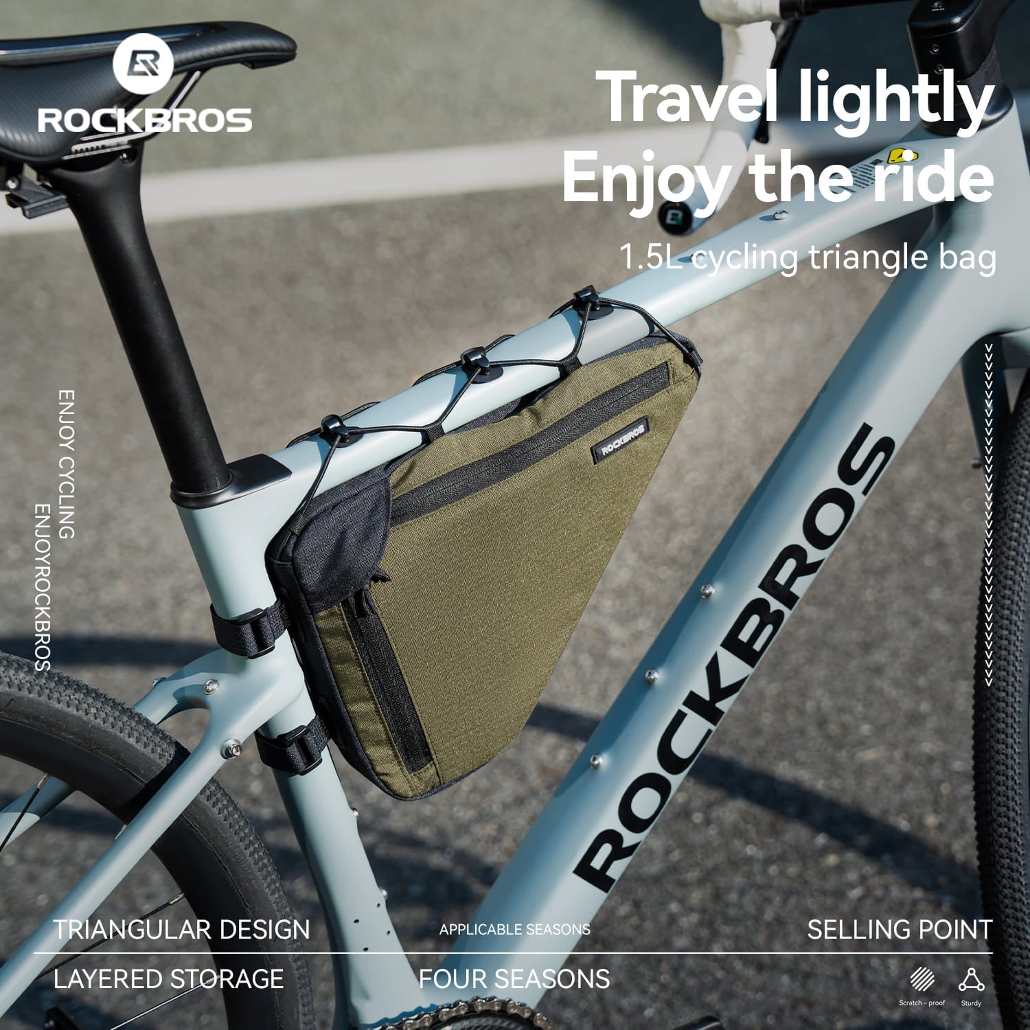 1.5L bike triangle bag with durable polyester fabric, PE support board, and tool-free adjustable straps. Slim aerodynamic design with layered storage and side zipper allows quick access. Compatible with gravel, road, and mountain bikes.