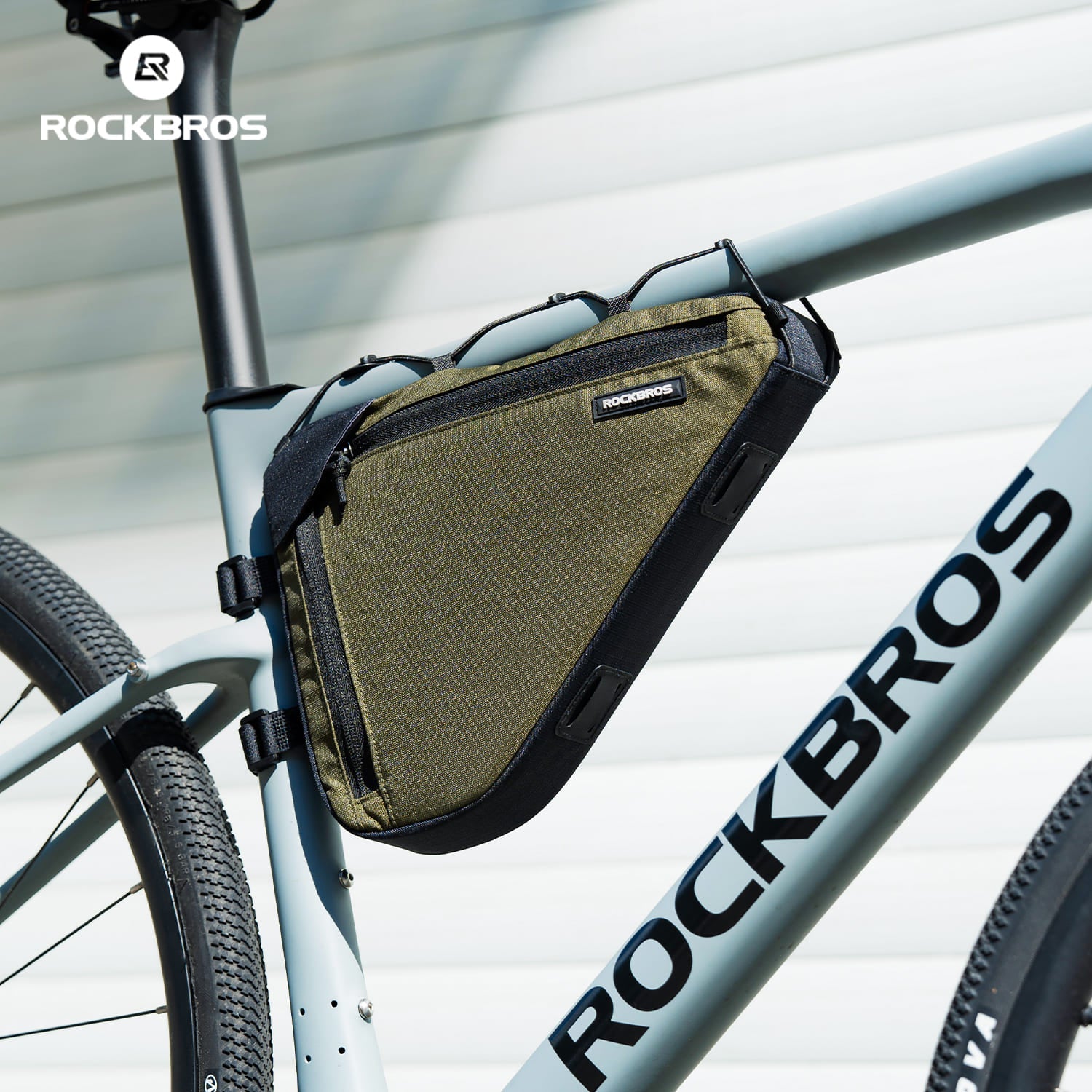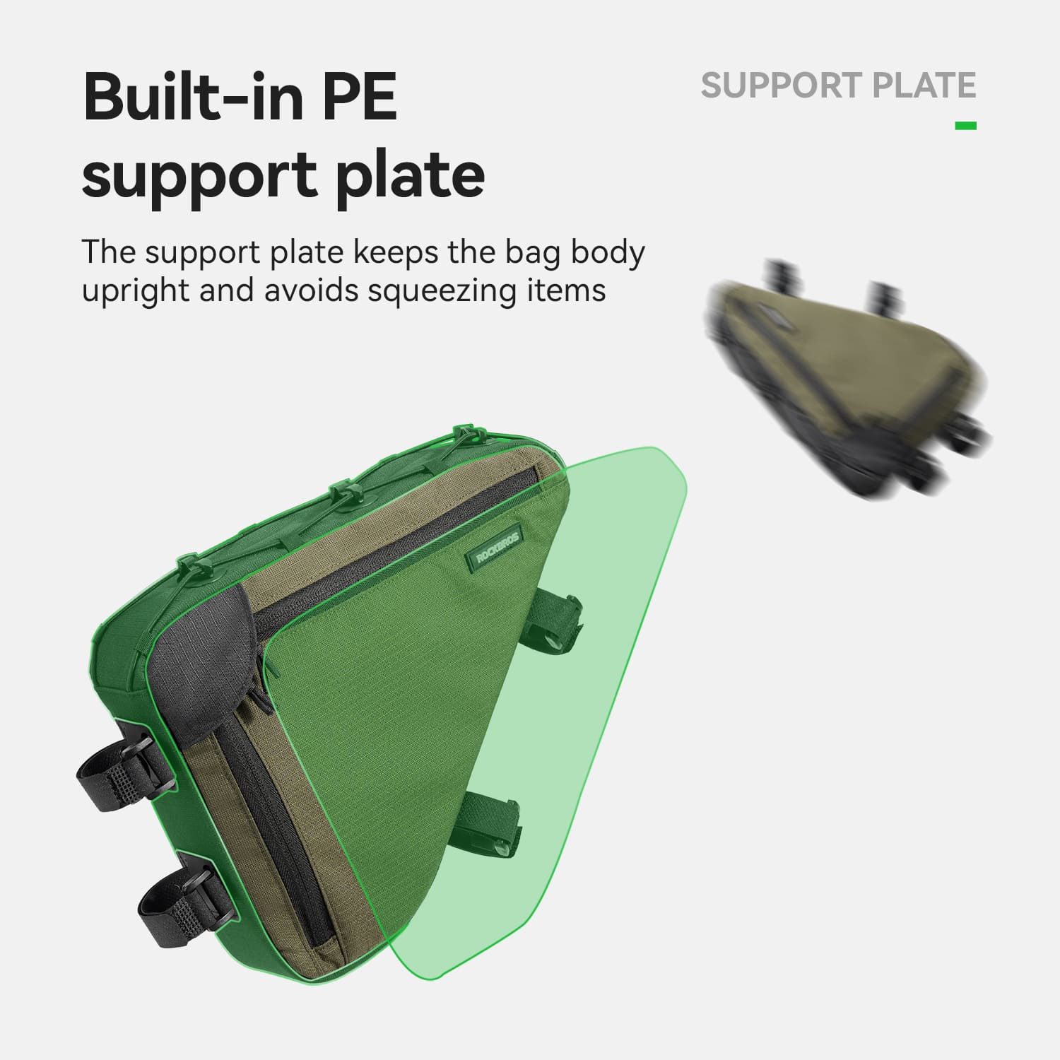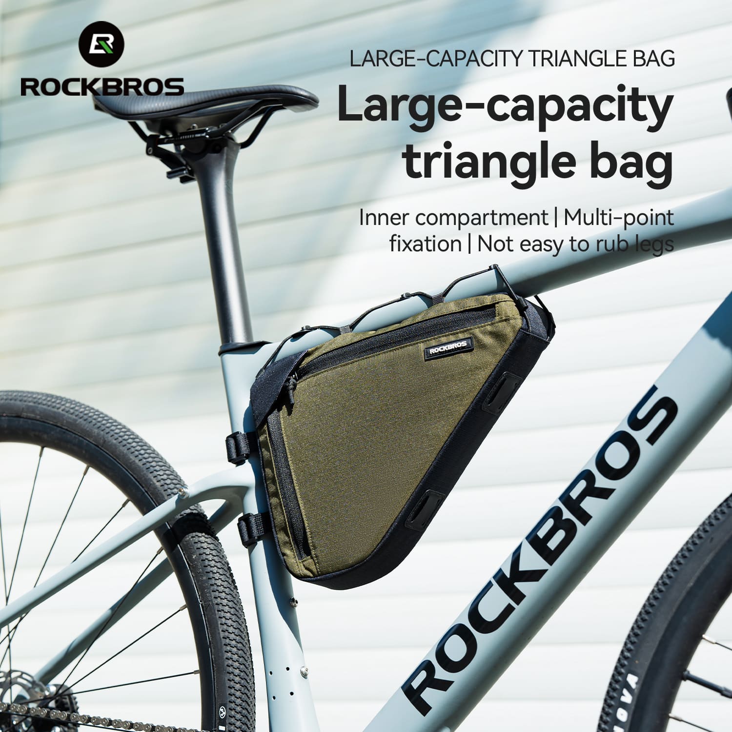 1.5L bike triangle bag with durable polyester fabric, PE support board, and tool-free adjustable straps. Slim aerodynamic design with layered storage and side zipper allows quick access. Compatible with gravel, road, and mountain bikes.