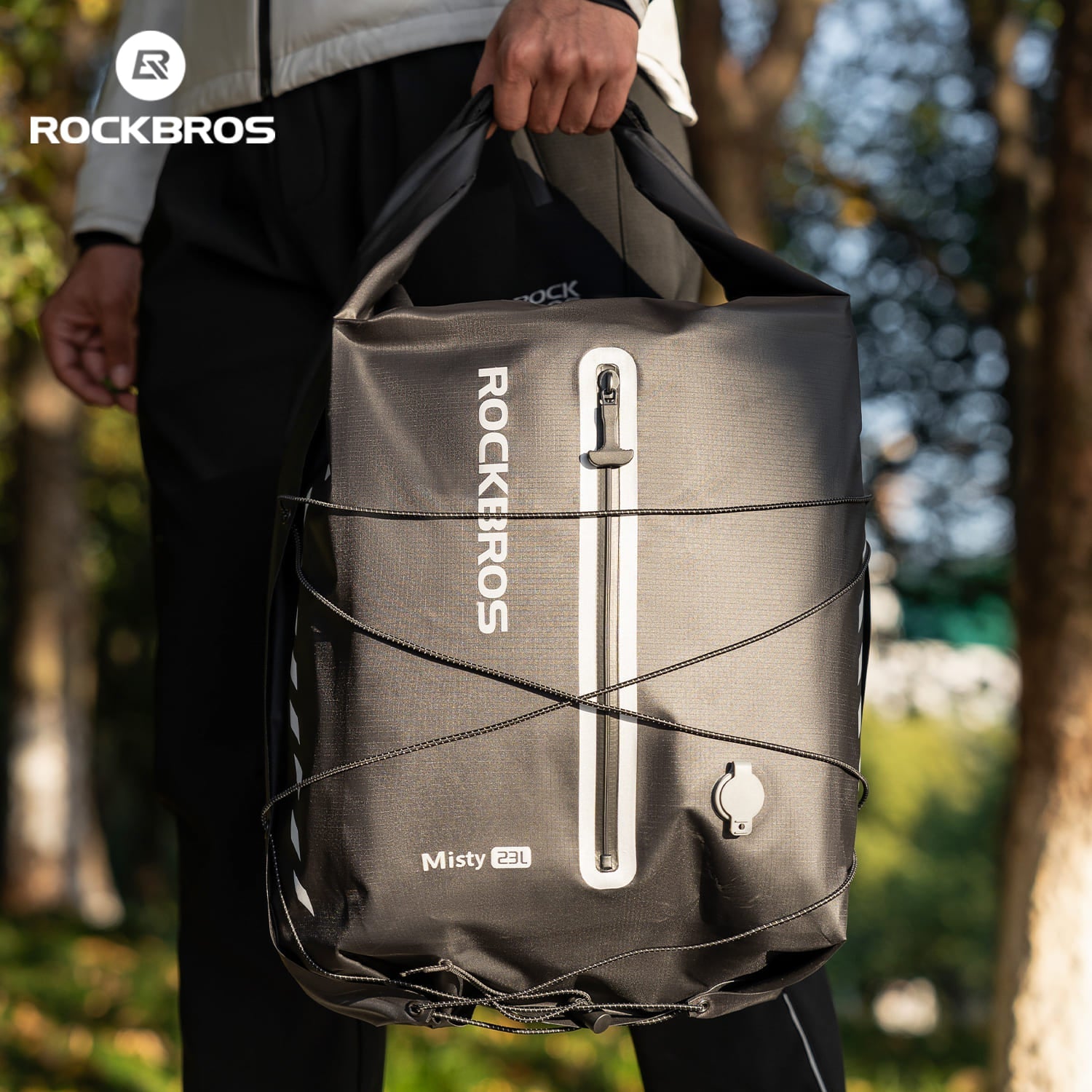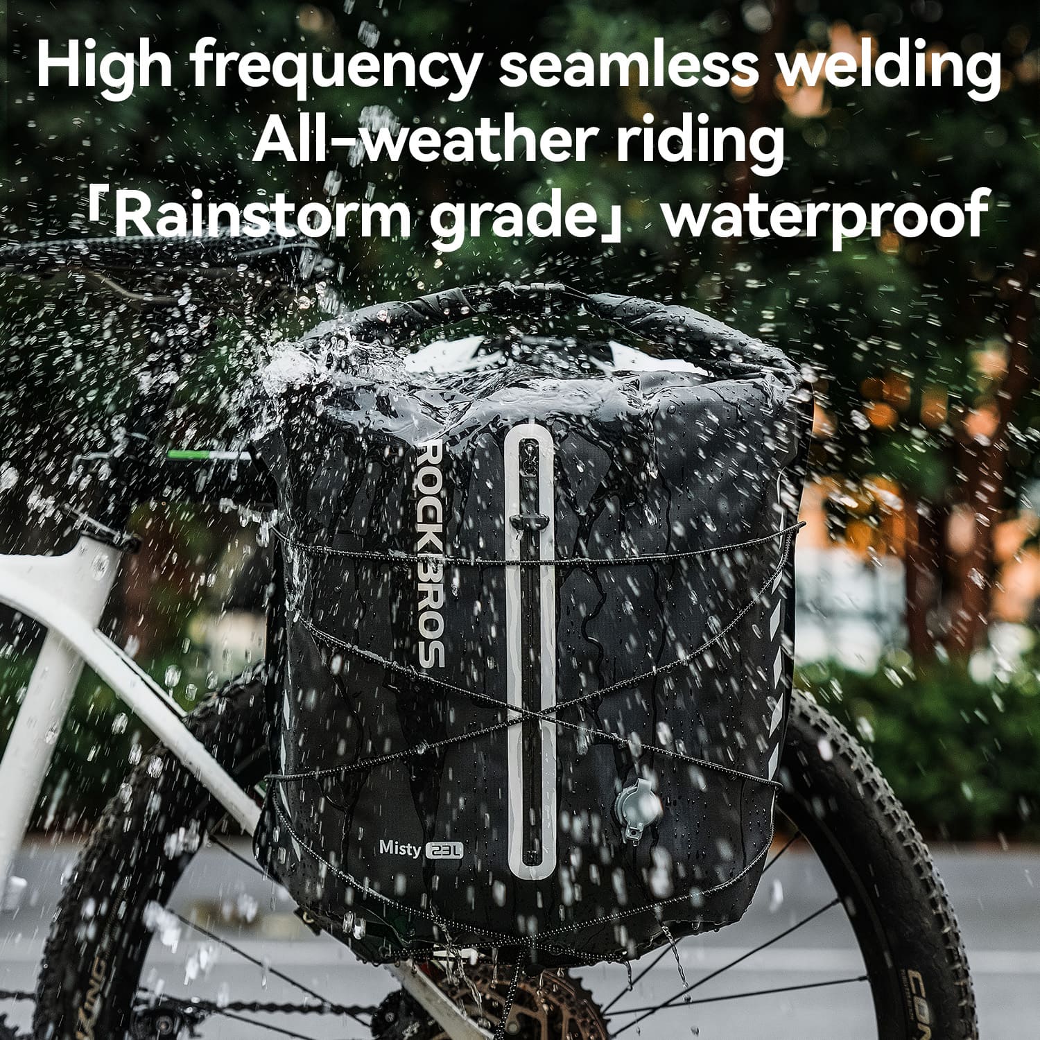 Lightweight waterproof bike rear rack bag with 23L capacity and wide opening for easy storage. Seamless welded construction provides reliable rain protection, while the carry handle and side elastic cords offer convenient installation and extra storage for commuting or touring.