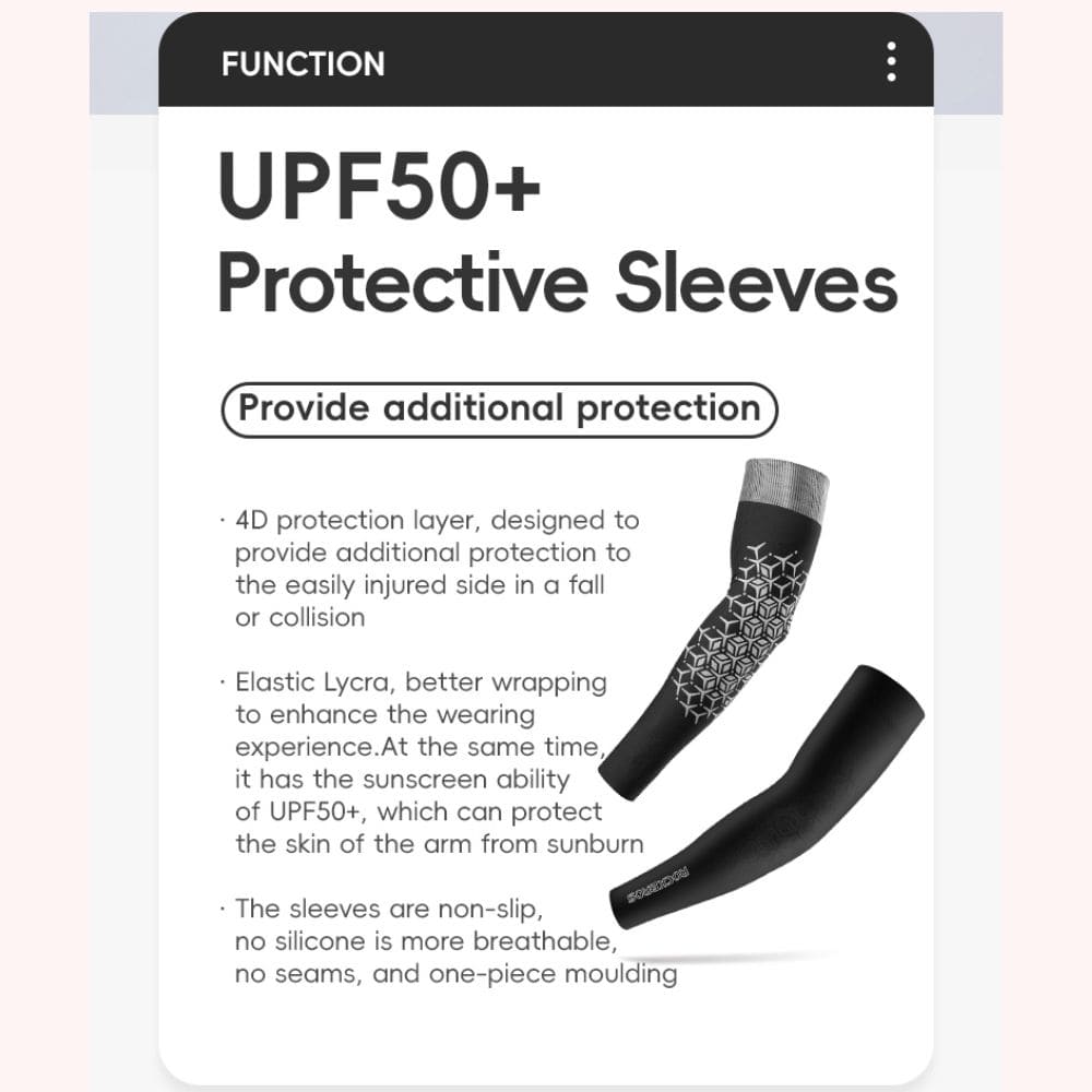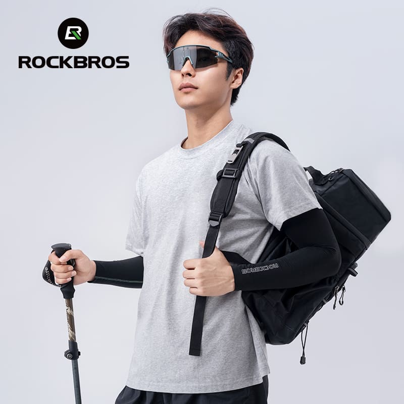 ROCKBROS ice silk cycling arm sleeves provide UPF50+ sun protection, 4D side impact protection, breathable moisture-wicking fabric, elastic comfortable fit, and non-slip cuffs for safe, comfortable outdoor sports.