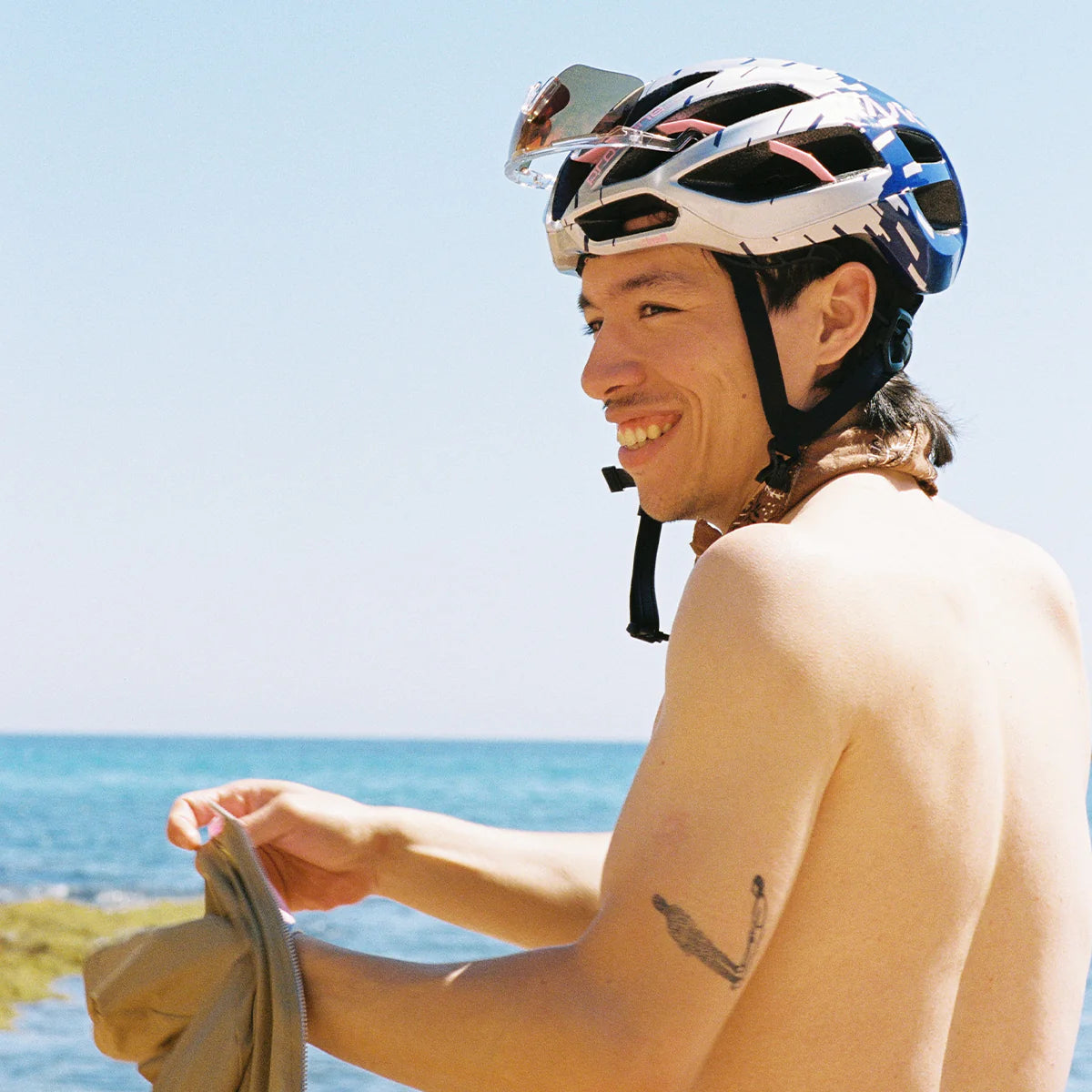This bold new collection redefines performance aesthetics through a striking collision of graphic language and racing heritage. Drawing inspiration from the hypnotic chaos of “razzle-dazzle” naval camouflage and the fluid elegance of color gradients, the design direction creates a visual tension between geometry and motion. The result? A dynamic, futuristic aesthetic where bold angles dissolve into smooth fades — engineered to mirror speed itself. The Protone Icon adopts a vibrant Blue Riviera, evoking the sun-soaked curves of coastal routes and the spirit of Cinelli’s legendary all-terrain racer, the “Riviera.”
