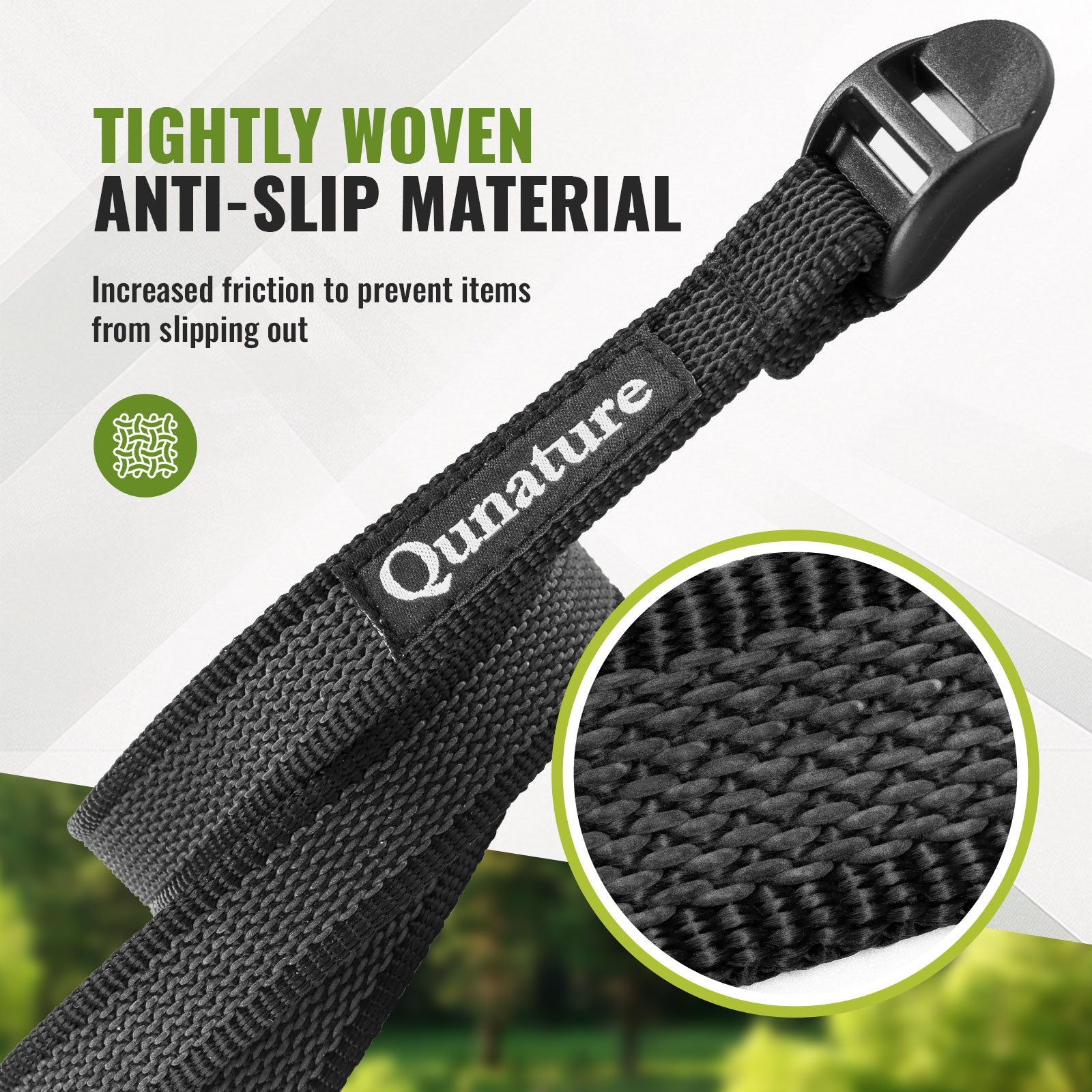 Qunature Bicycle Cargo Straps use a tight, latex-coated weave for strong grip and secure fastening. Durable polypropylene-latex material supports up to 70kg, with adjustable buckles for flexible length and multi-use cargo bundling.